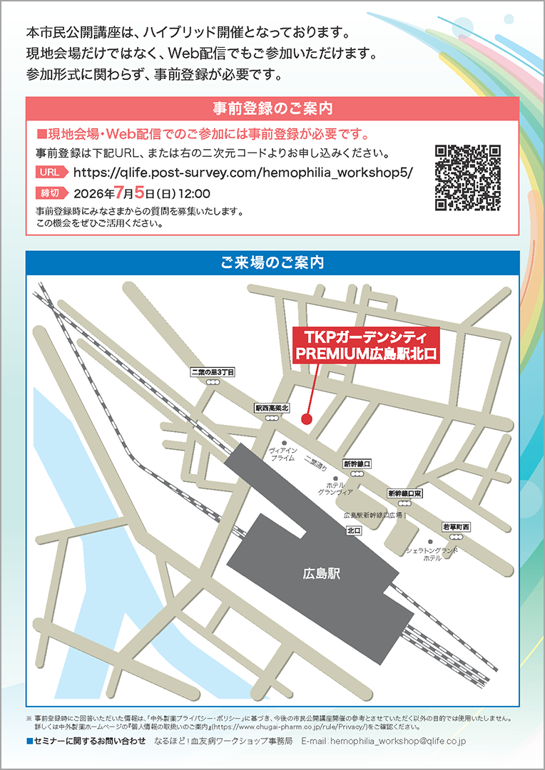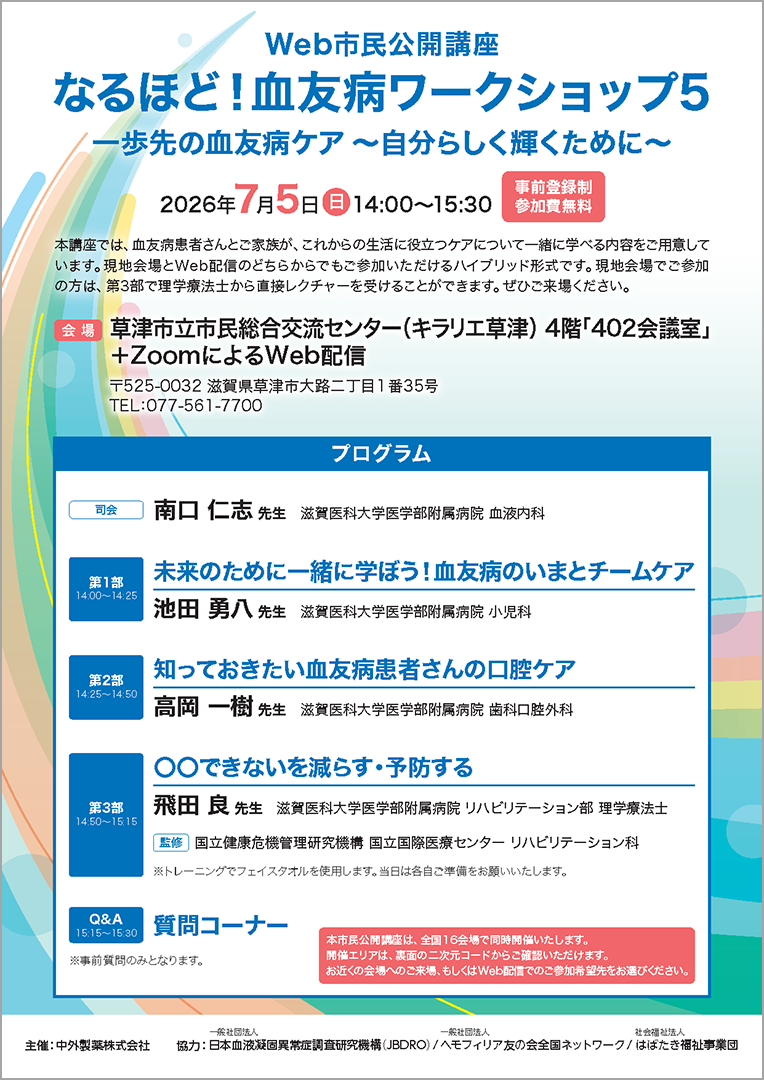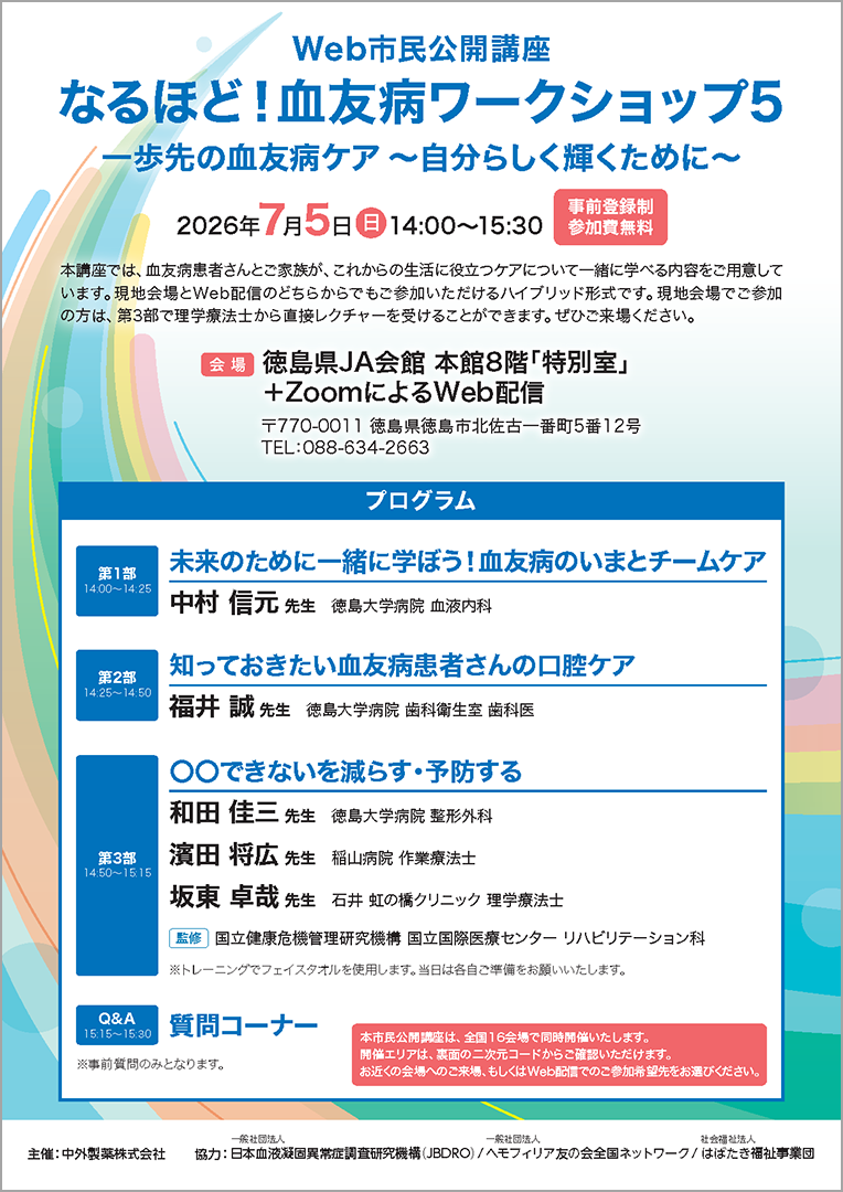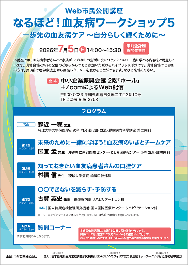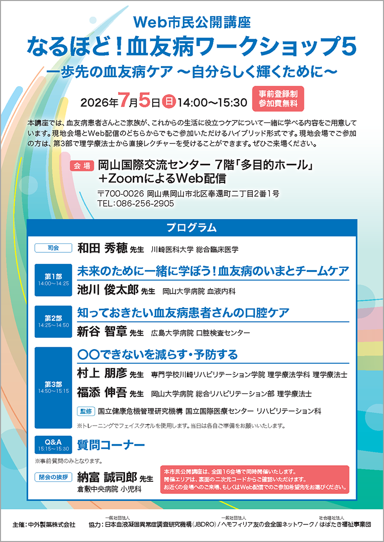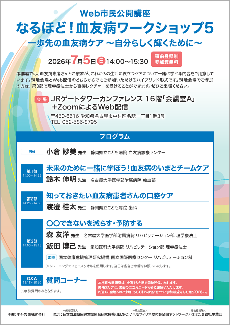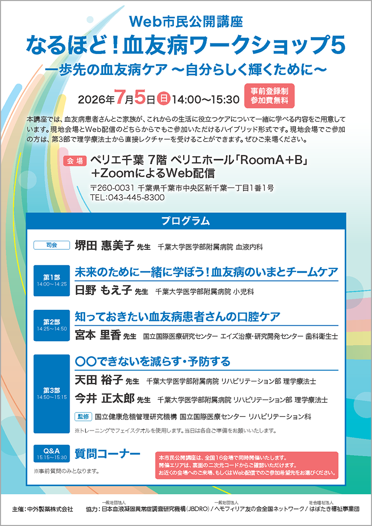 2026年7月5日(日)に、「なるほど!血友病ワークショップ5」と題して市民公開講座が開催されます。