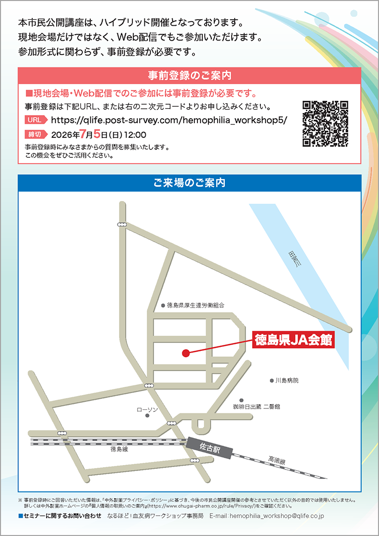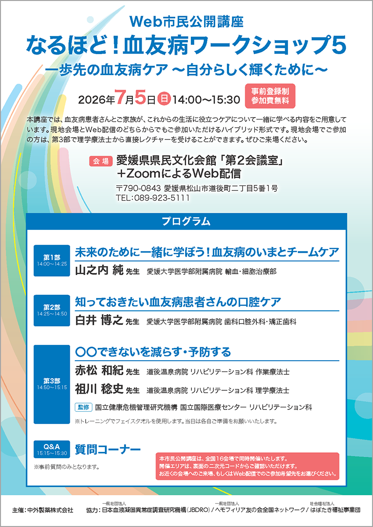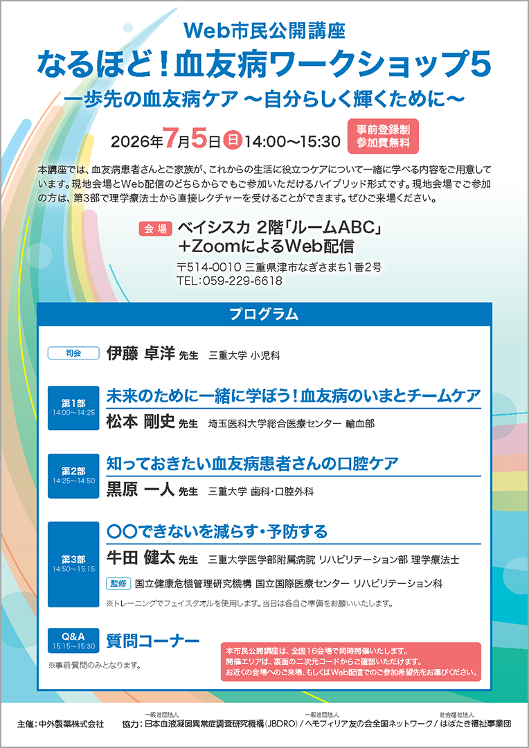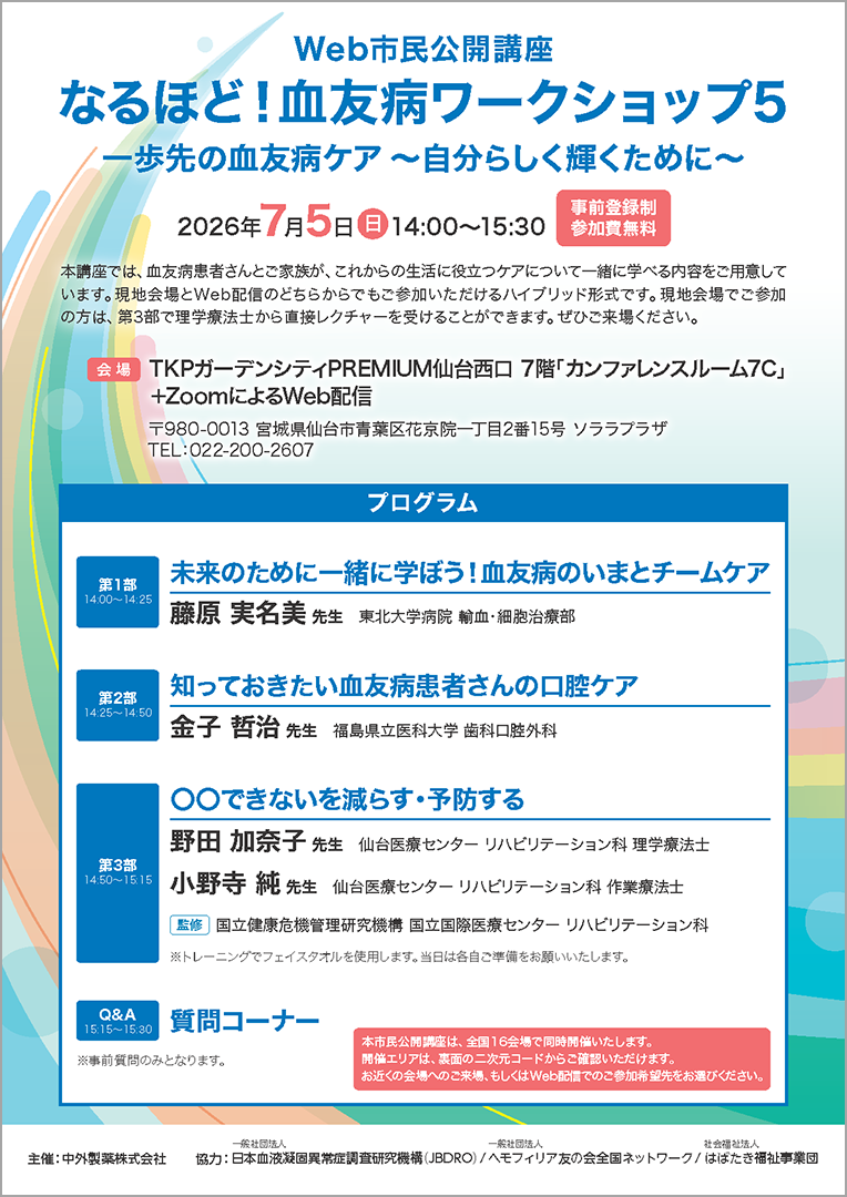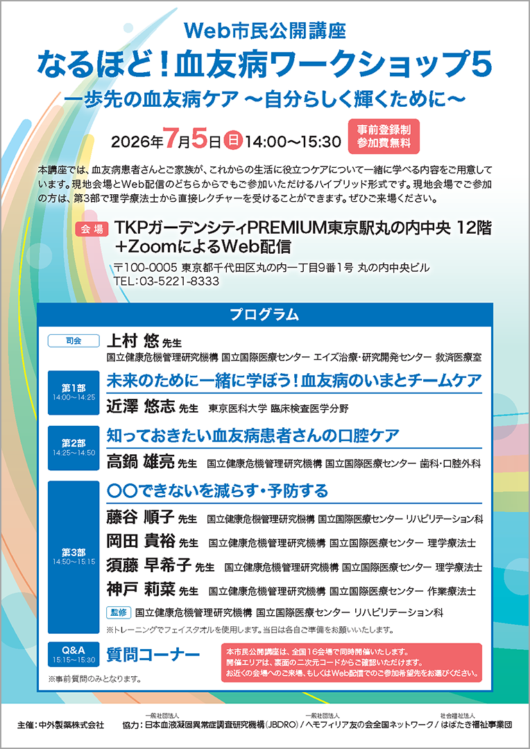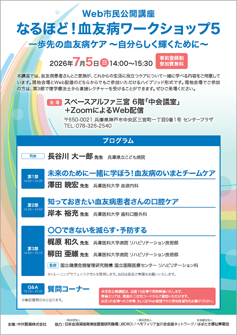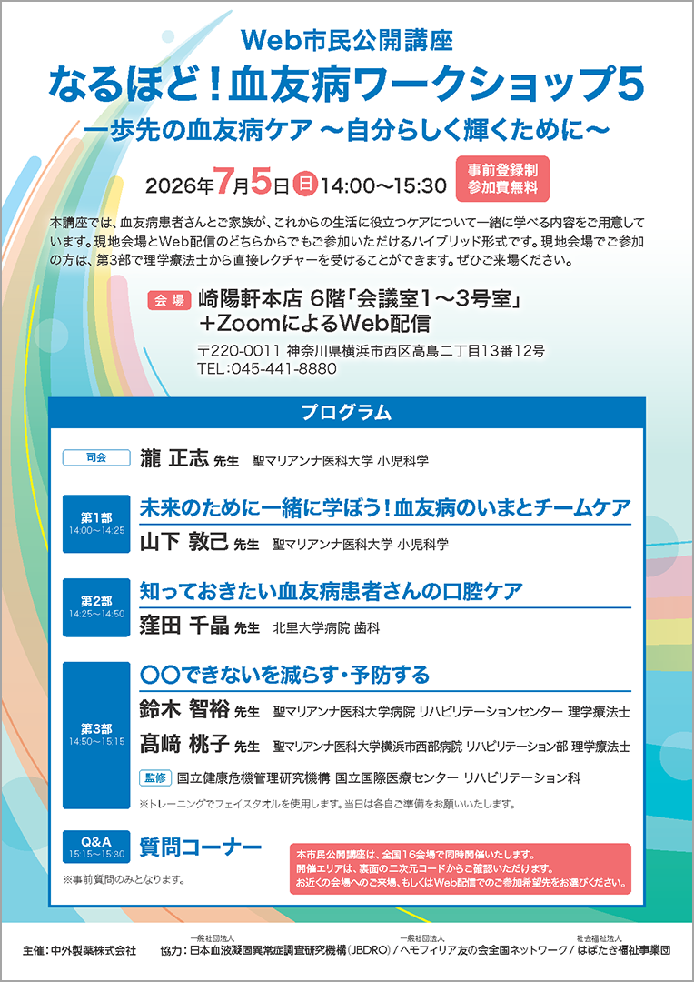2026年7月5日(日)に、「なるほど!血友病ワークショップ5」と題して市民公開講座が開催されます。